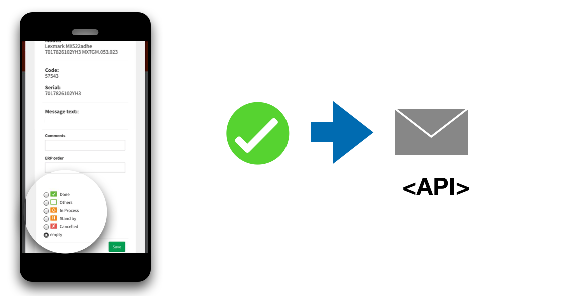 When a status is changed, from the desktop environment, in the office or from the mobile, on the go, the customer receives an automatic notification by email. If you have your own management software (CRM or ERP), the system will keep it updated via API.