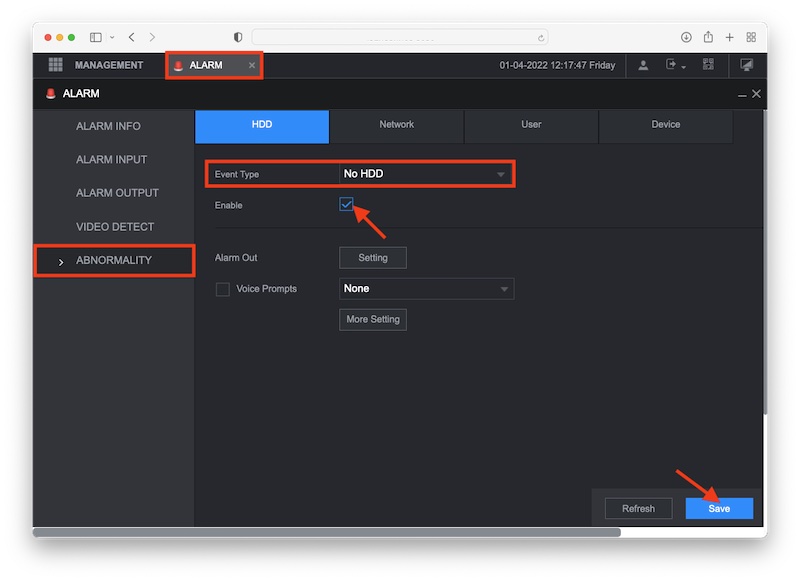 Haga lo mismo con las notificaciones del disco duro. Alarm / Abnormality / HDD y pulse "enable". Repita la acción en todos los eventos de los que quiera recibir notificación. Pulse "save" al final.