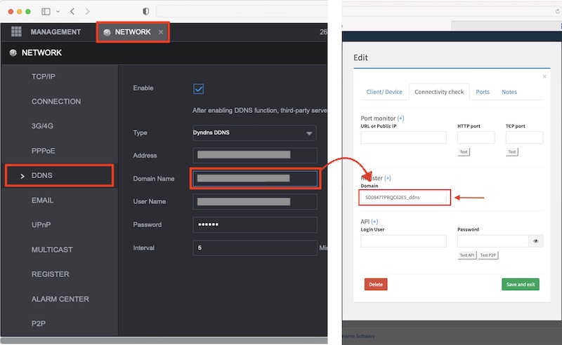 Abrir el menú, Network, DDNS y copiar el "Domain name" para pegarlo en la ficha del grabador en AMR connect. De esta forma cuando llegue una alarma, es sistema la podrá asociar con el gravador correcto.